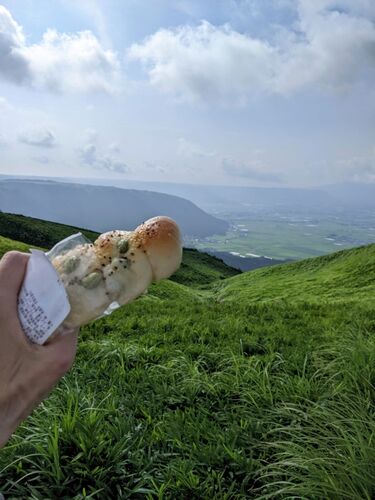 大観峰に移動しました。 暑いし夏休みだしお盆だし早朝なのにバイクや車が多めです。 朝食 ツーリングの前日にマックスバリューで買った枝豆パン。 あいにくの曇り空だけどいい景色を眺めながらの朝食は旨い! 食後は今まで通ったことのない遊歩道を散策。 …